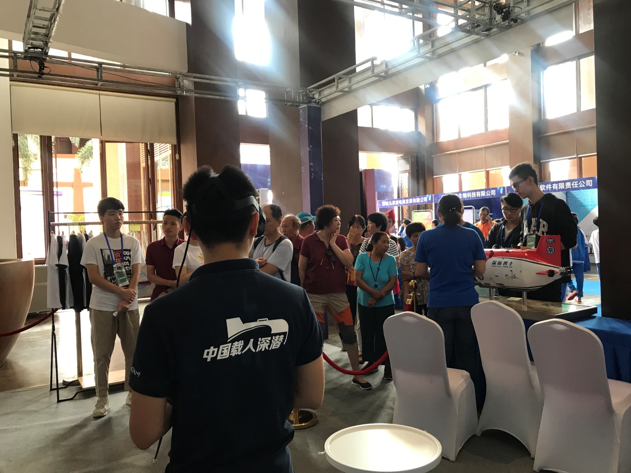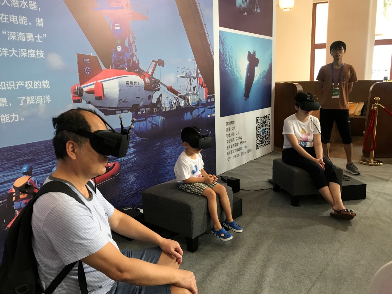 會展中,中科院深海所通過虛擬現實技術,多維解析我國擁有自主知識產權的載人潛水器“深海勇士”號,親身體驗跟隨潛器“下潛”到深海,同時配合“深海勇士”號模型、深海科考系列紀念品,幫助觀眾了解載人潛水器深海科考的作業場景、海洋資源開發前景與我國深海譜系化裝備自主創新能力。