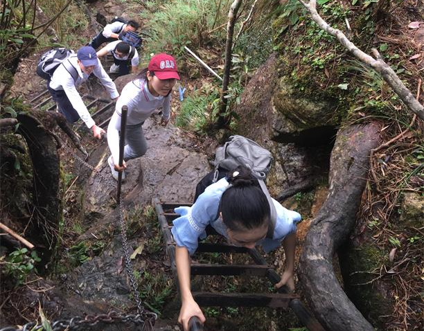 當天上午1030分,參加活動的成員抵達五指山自然保護區,分成四個小分隊開始登山。其中第一分隊一馬當先,追溯昌江源頭路線最先抵達;第三和第四分隊也按計劃登山,沿途感受著熱帶雨林的瀑布潺潺和林木蒼翠;第二小分隊,目標直指五指山頂峰,經過木棧道后,沿著盤根錯節的原始小徑和幾乎垂直的鐵梯,手腳并用一路攀爬,登上了云霧繚繞的五指山一峰,隨后一鼓作氣,登上了最高峰——海拔1867米的二峰。