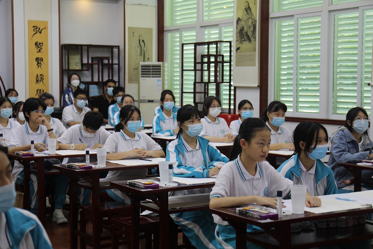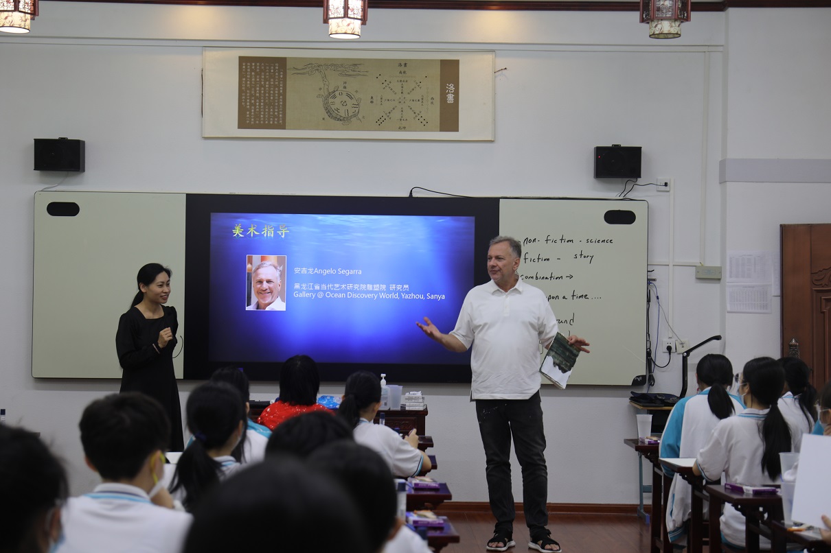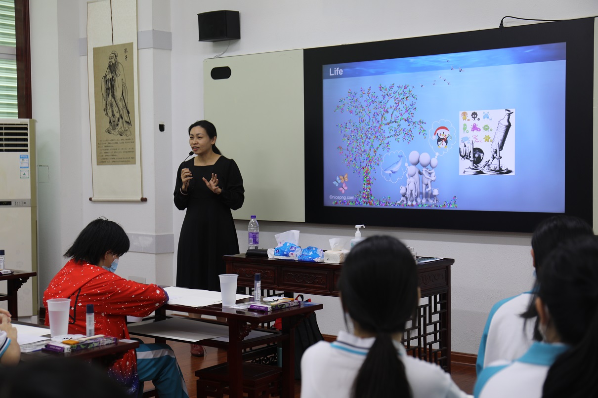 首先,來自深海所地外海洋系統研究室劉翠艷研究員為同學們開展生動的科普宣講,以幻燈片展示、現場交流互動以及視頻介紹等方式通俗易懂地傳授生命的豐富形式、講述海洋故事,科普深海知識,宣教“地外海洋”概念,提升海洋文化的親和力、感召力與影響力。同學們聽得津津有味,受益匪淺。在隨后的藝術創作環節,活動特邀藝術家Angelo Segarra先生作為現場美術指導,引導學生們繪制圖冊來編寫一個科學性或科幻性的海洋故事。活動中,學生們認真作畫,在水彩描繪的背景上勾畫出海洋中的珊瑚、水草、魚、蝦、蟹、水母、鯨魚等海洋生物,呈現他們腦海中的海洋故事。活動最后,學生們現場分享自己的作品:初一的陳雅昀同學生動形象地繪制了海洋中危險環境,提醒大家要敬畏海洋,不要到危險未知區域玩耍;李雅倩同學則描繪了一只誤吞塑料袋的小鯨魚痛苦地向人類呼救,呼吁大家保護海洋環境,重視海洋污染;簡玉萱同學則用擬人的手法編寫了一個小螃蟹和小鰻魚斗智斗勇的故事。活動結束后,同學們紛紛表示對深海科學、海洋生態保護以及地外海洋的探索產生了濃厚的興趣。