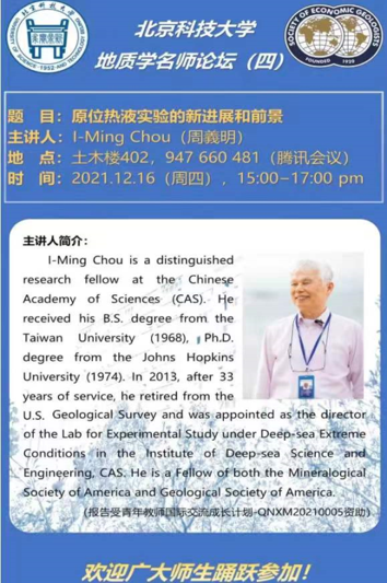 2021年12月16日,中科院深海所深海極端環境模擬研究實驗室主任周明研究員應北京科技大學鐘日晨副教授及國際經濟地質學家學會北京科技大學學生分會邀請,在線做客“北京科技大學地質學名師論壇”并作題為“原位熱液實驗的新進展和前景”專題講座。