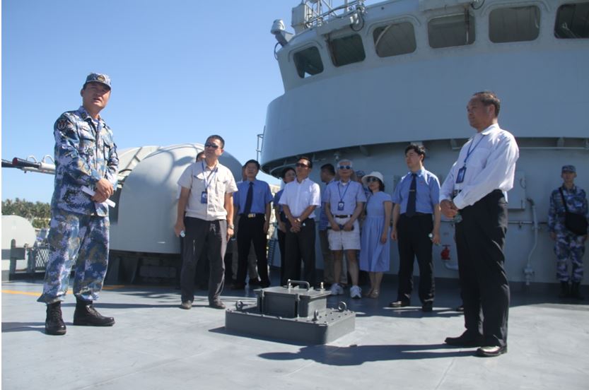 七月的三亞,滿目蒼翠,碧海藍天,軍港內(nèi)一艘艘戰(zhàn)艦在碧波青山前顯得尤為雄偉壯觀。此次教育活動參觀的戰(zhàn)艦為綿陽艦。據(jù)介紹,綿陽艦是中國自行設(shè)計建造的新型導(dǎo)彈護衛(wèi)艦,該艦曾赴亞丁灣、索馬里海域執(zhí)行護航任務(wù)。在官兵的帶領(lǐng)下,大家先后參觀了反艦、防空、反潛等各式武器裝備,了解各類武器性能,近距離觀察體會了近年來海軍建設(shè)發(fā)展取得的輝煌成就。
