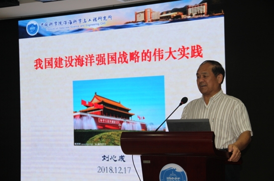 12月17日,中國科學院深海科學與工程研究所在1003會議室組織召開紀念改革開放40周年學習交流會,首席顧問劉心成作“我國建設海洋強國的偉大實踐”專題報告。