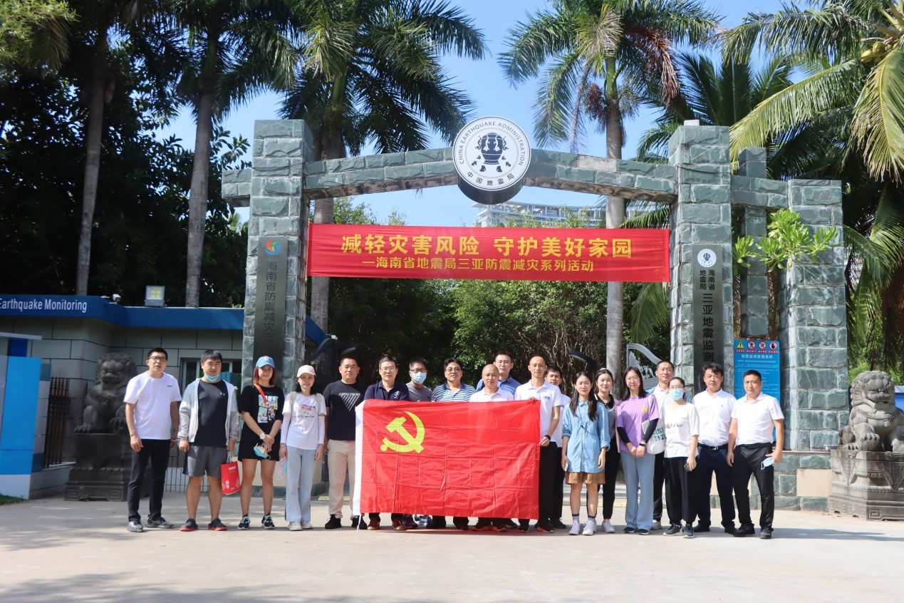 科學(xué)部第二黨支部和海口地調(diào)中心臨時(shí)黨支部黨員在三亞地震臺(tái)站與黨旗合影