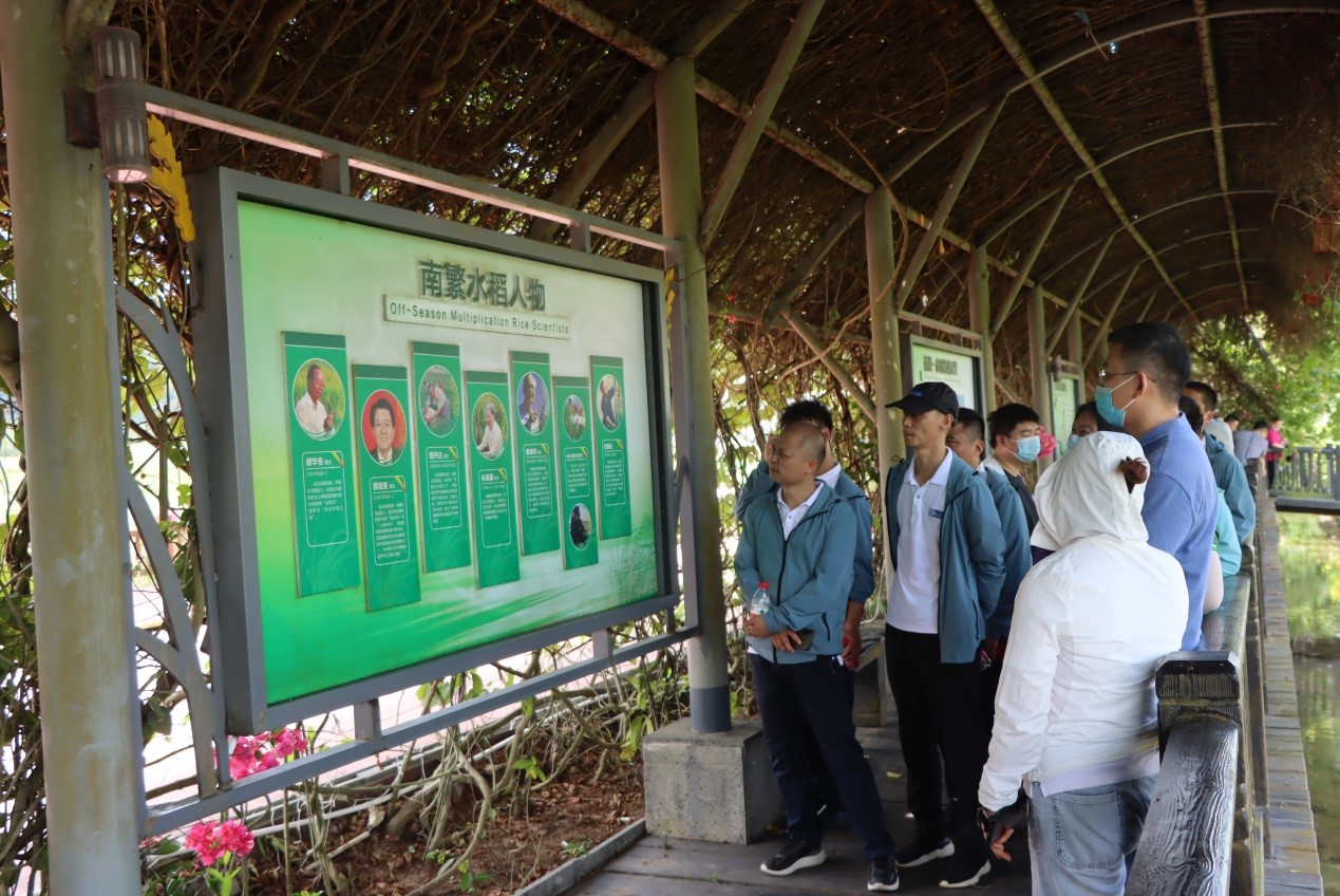 各個(gè)支部黨員在認(rèn)真聆聽水稻國(guó)家公園工作人員講解雜交水稻的科普知識(shí)