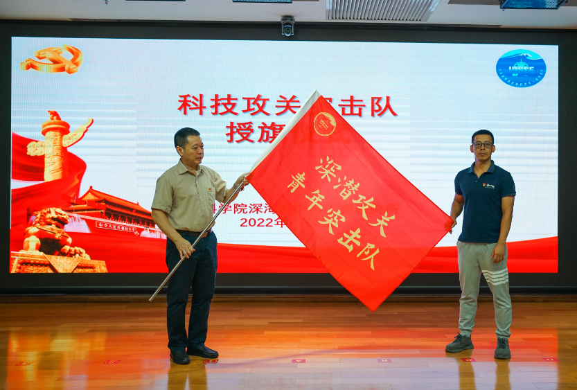 會上還舉行了科技攻關突擊隊授旗儀式。陽寧為深海基站攻關突擊隊、海底移動作業平臺攻關突擊隊、深潛攻關青年突擊隊、深淵科學攻關突擊隊授旗。