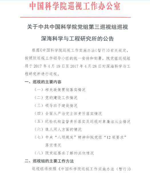 關于中共中國科學院黨組第三巡視組巡視深海科學與工程研究所的公告
