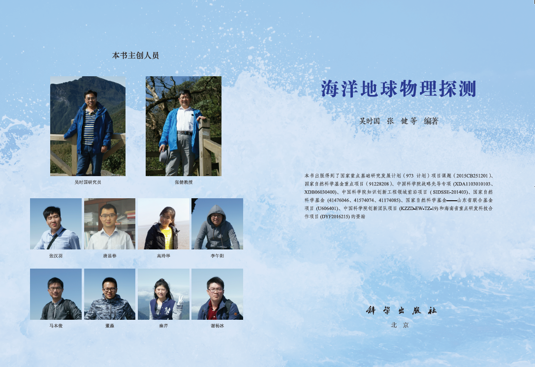 2017年7月,由深海所署名資助,深??茖W部-深海地球物理與資源研究室吳時國研究員、中國科學院大學地球科學院海洋地球物理(地熱與地球動力學) 學科組張健教授等人聯合編著的《海洋地球物理探測》一書在科學出版社(北京)正式發行。