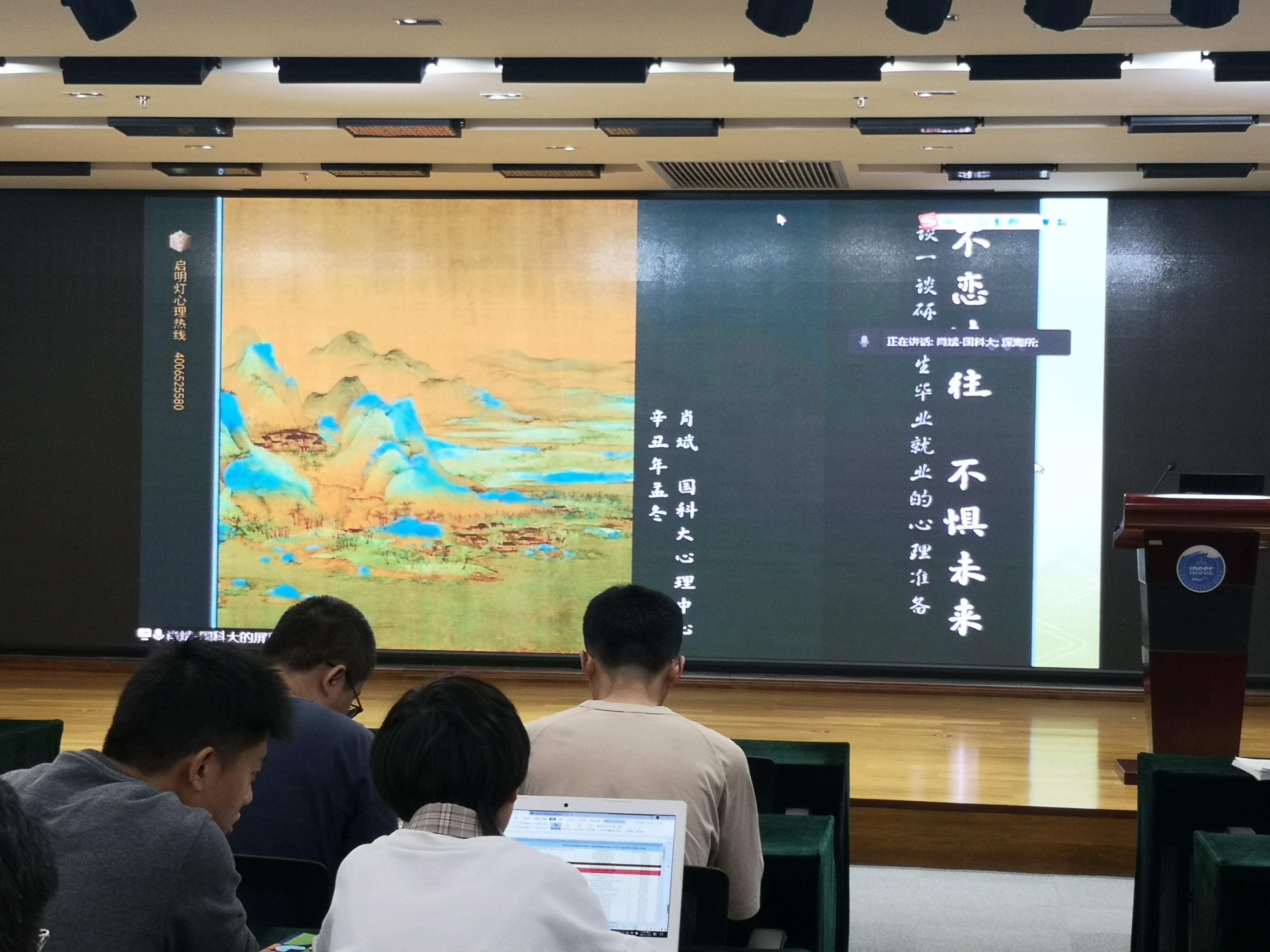 肖斌在講座中為大家分析了研究生畢業就業時常見的焦慮原因,例如信息網絡的全覆蓋、學生與社會的脫節、就業的艱難選擇、與曾經的同學格格不入、理想與現實的落差等,幫助我們從古代詩詞與中華文化中尋求解決之道,包括全方位認識自己、學會換角度看待問題、學會脫離舒適區、以平常心看待失敗與遺憾等。肖斌的講座是潤物細無聲的引導啟發,為同學們的畢業就業做了一次極好的心理建設。