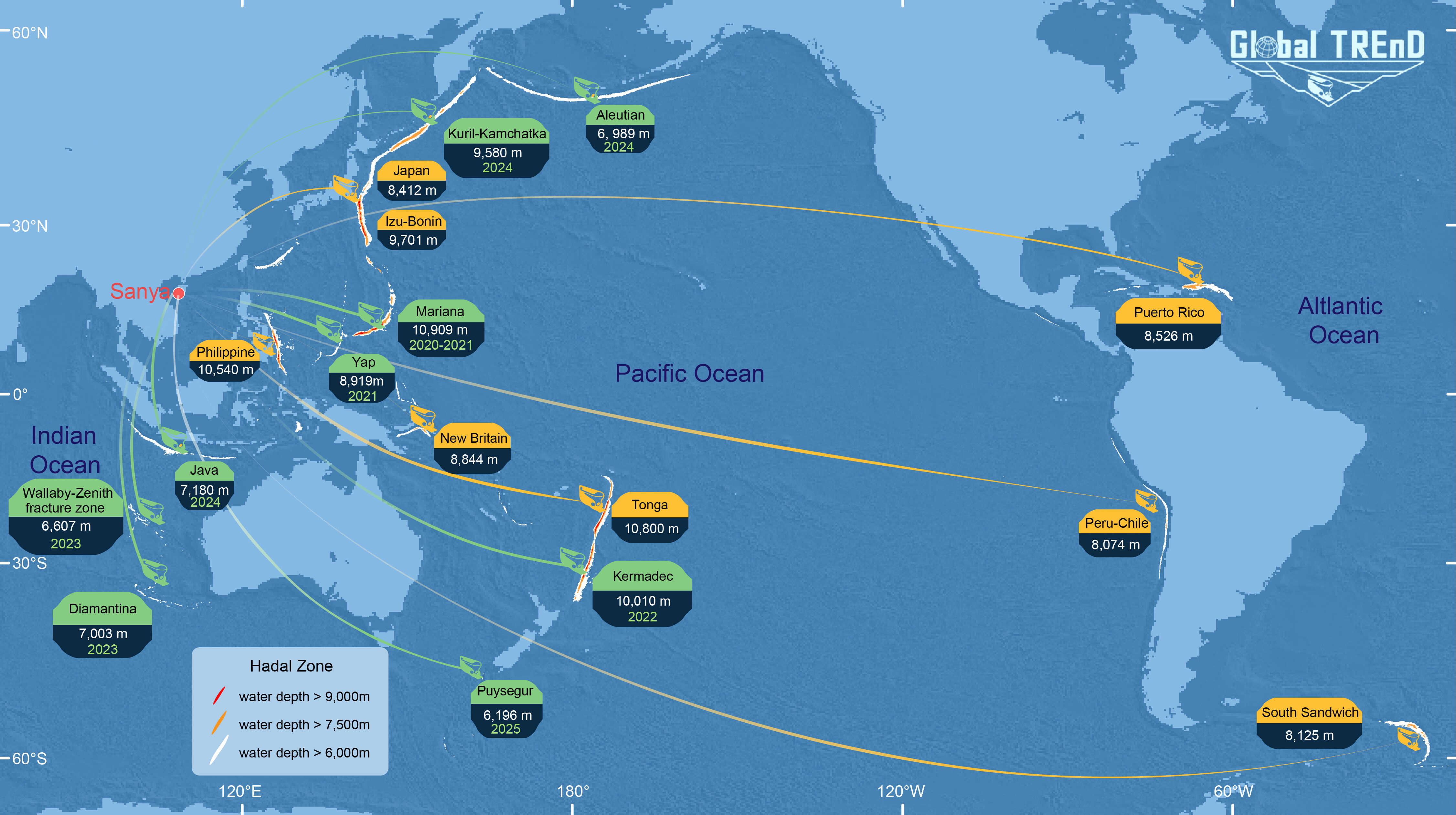 依托國際上唯一的強作業(yè)能力萬米載人潛水器“奮斗者”號以及“探索”系列科考船為全球深淵科考平臺,中國科學院部署啟動“全球深淵深潛探索計劃(Global TREnD)”,中國科學院深海科學與工程研究所(簡稱“深海所”)作為該計劃的牽頭單位,進一步開展多國聯(lián)合、多學科綜合深潛考察。該計劃得到了來自新西蘭、智利、丹麥、印度尼西亞、巴西、德國等10多個國家的參與和支持,已對馬里亞納、雅浦、克馬德克、蒂阿曼蒂那、瓦萊比-熱恩斯、爪哇、千葉-勘察加、阿留申、普伊斯哥等九條全球主要海溝深淵進行了載人深潛科考,取得一系列原創(chuàng)性科學發(fā)現(xiàn),創(chuàng)造多項世界載人深潛作業(yè)紀錄。