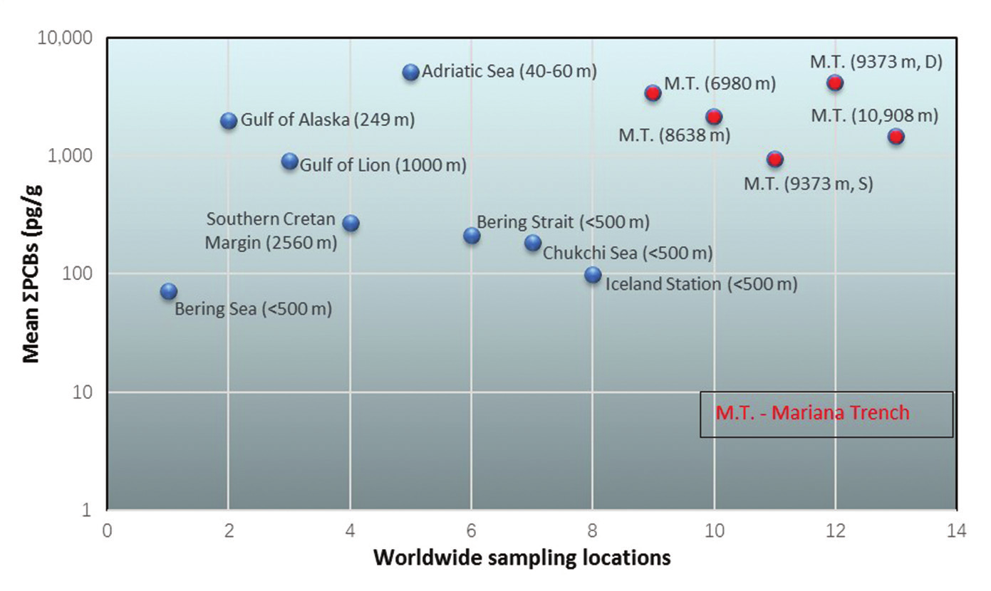 為了研究持久性有機污染物在深海環境中的分布特征和賦存狀態,中科院深??茖W與工程研究所彭曉彤研究員團隊對馬里亞納海溝挑戰者深淵表層沉積物中的持久性有機污染物多氯聯苯類和多溴聯苯醚類持久性有機污染物進行了研究。結果表明,海溝水深6980-10908 m表層沉積物中多氯聯苯類總濃度為9314195 pg/g,高于其它較淺海域沉積物中的含量;類二英多氯聯苯的毒性當量(TEQ)為0.65-14.9 pg/g,比大多數從半工業區到工業區收集到的海洋表層沉積物中的毒性當量要高;而8種多溴聯苯醚的總濃度(平均值為136 pg/g)要比前人研究的大陸架表層沉積物濃度要。馬里亞納海溝底部沉積物中累積了如此高濃度的多氯聯苯類毒性有機污染物著實令人吃驚。這些結果表明,持久性有機污染物已經到達了世界海洋中最深處,海溝沉積環境對持久性有機污染物的富集具有明顯的放大效應。這些結果也同時暗示,地球上可能已經不存在不受人類活動影響的一方凈土。