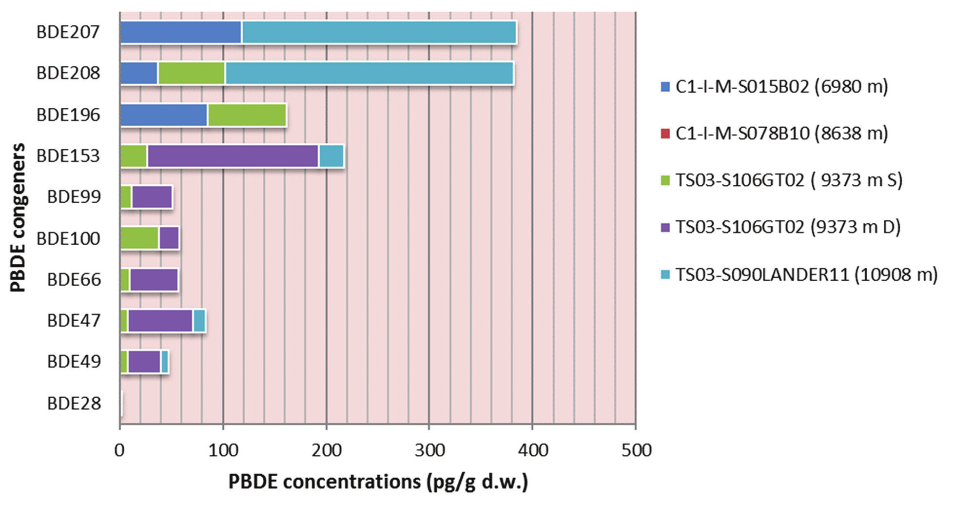 2 馬里亞納海溝底層不同樣品中多溴聯苯醚同系物的濃度