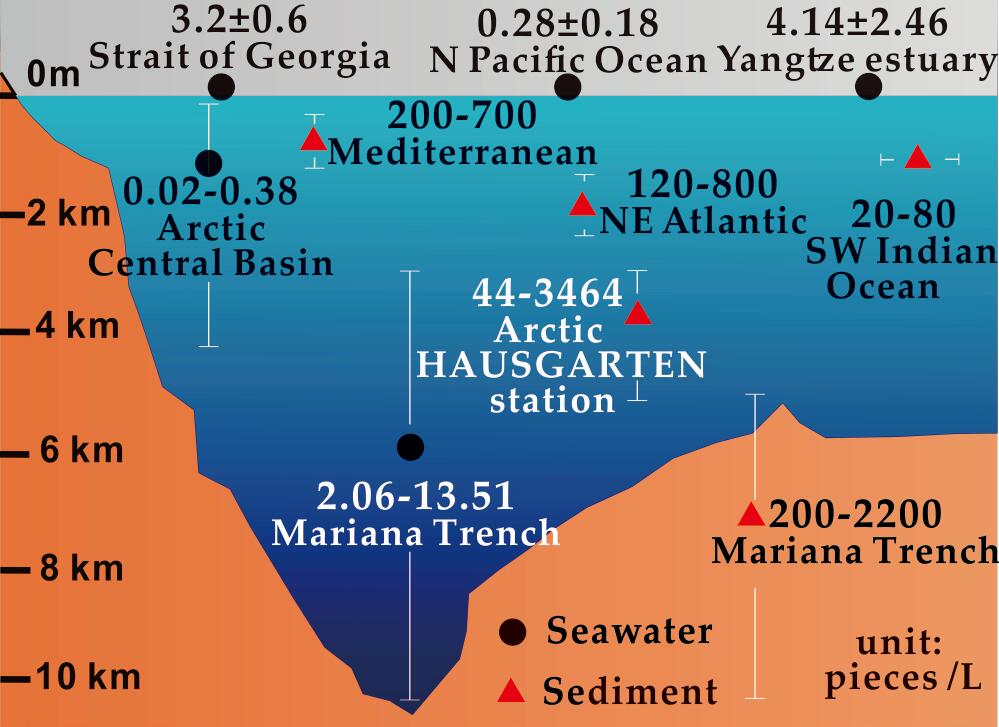馬里亞納海溝挑戰者深淵與世界其它海域微塑料含量對比