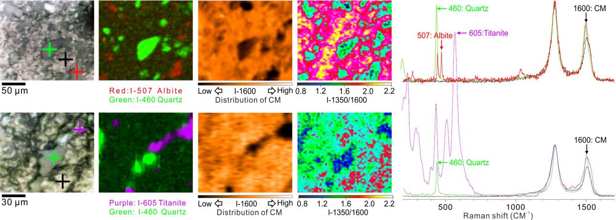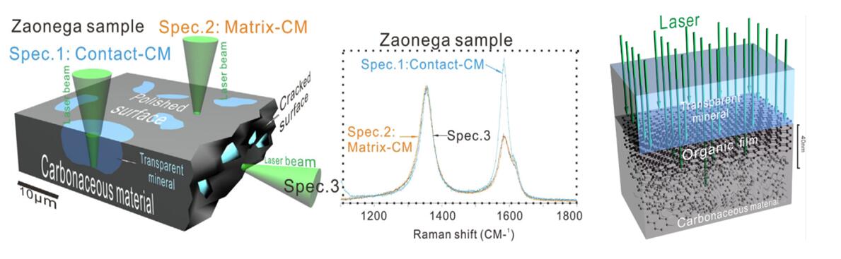 近日,地外海洋系統(tǒng)研究室屈原皋研究員及其團(tuán)隊(duì)運(yùn)用拉曼光譜學(xué)方法在古元古代(約20億年前)地層中發(fā)現(xiàn)熱液流體中有機(jī)分子以礦物為模板有序排列并在礦物表面組裝形成類似有機(jī)膜的結(jié)構(gòu)。此過(guò)程中受溫度、壓強(qiáng)、礦物晶型、表面電荷等綜合因素影響,最終導(dǎo)致礦物表面有機(jī)膜的分子有序度不同。