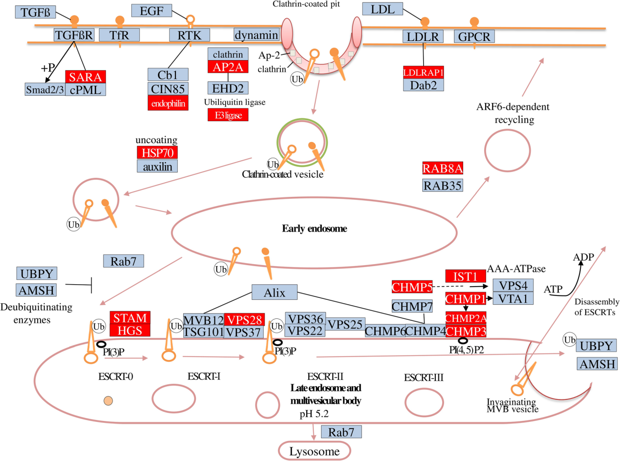 2 參與泛素化和內吞作用的代謝通路示意圖  在高壓下顯著高表達的基因用紅色標出