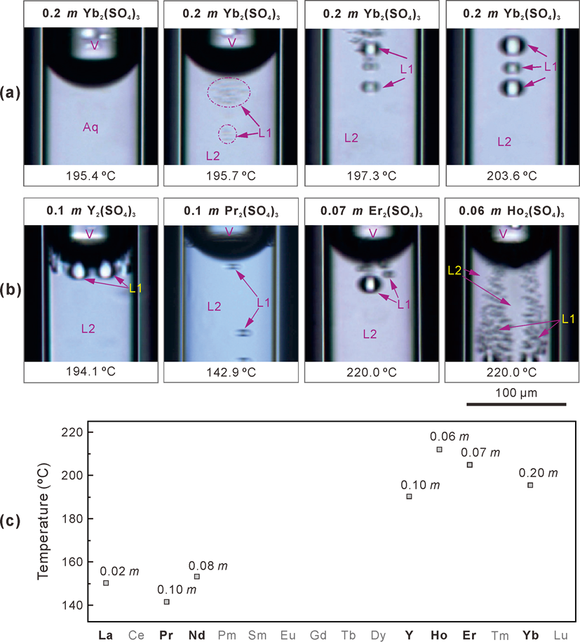 研究表明,含稀土硫酸鹽熱液在高溫條件下可分離為不混溶的兩種液相,一為高度富集REE和硫酸鹽的高密度液相(L1),一為貧REE和硫酸鹽的低密度液相(L2) (1)。這種現(xiàn)象傾向于在富CO2、低壓和低氯化物含量的熱液中發(fā)生。由于不混溶的兩個液相具有明顯的密度差異且貧REE液相作為基質(zhì)具有較低的粘度,富REE液相將在重力作用下與貧REE液相高效分離,從而實現(xiàn)熱液體系中REE的高效富集,為高品位稀土礦床的形成提供物質(zhì)基礎(chǔ)。