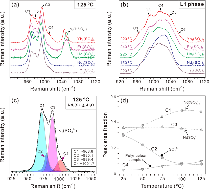 應(yīng)用原位拉曼光譜分析技術(shù)對高溫高壓條件下流體的組成和結(jié)構(gòu)進行了在線分析。結(jié)果表明,除了前人報道的REESO4+REE(SO4)2 (C3, C1),REE3+SO42-可形成更為復(fù)雜的絡(luò)合物(REEm(SO4)n3m-2n, m>1,C4, C5, C6) (2)。上述復(fù)雜絡(luò)合離子對的形成導(dǎo)致了熱液流體中液-液不混溶的發(fā)生。此外,HSO4也可與REE3+直接絡(luò)合并遷移REE (2)