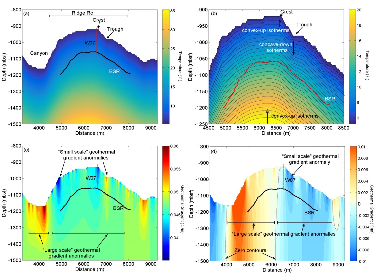 結合海底下溫度場的數值模擬分析結果分析認為這是由地形起伏造成的。研究區內兩種尺度的地形起伏影響水合物穩定帶,分別是峽谷與脊交錯分布造成的地形起伏以及脊上溝槽與局部高點交錯分布造成的地形起伏。