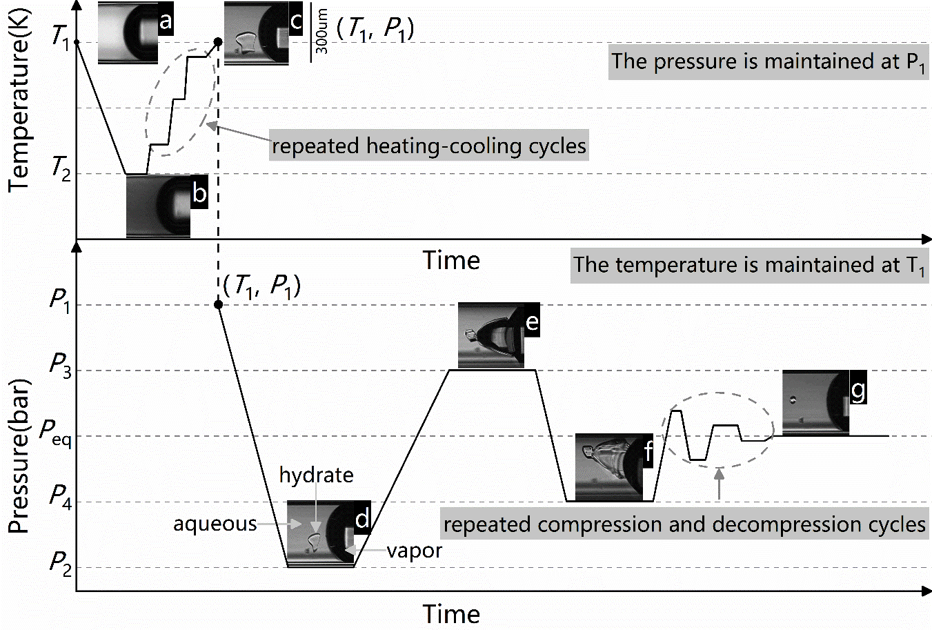 過冷度對微孔隙內水合物的形成特征有較大的影響,高過冷條件下毛細硅管中水-氣彎液面會先形成水合物光環,并向兩側生長,水合物以肉眼不可見的微晶、纖維狀和針狀晶體形態為主;中等過冷條件下水合物晶體以柱狀多面體和骨架晶體為主,水合物的轉化率要低于高過冷條件;低過冷條件下水合物以塊狀多面體形態為主,包括立方體和八面體。同時,該研究首次發現微孔隙內水合物能夠以“橋接”方式連接。相關研究成果發表于《ACS Omega》,“Crystallization Behavior of the Hydrogen Sulfide Hydrate Formed in Microcapillaries”(DOI: 10.1021/acsomega.1c01051)。文章第一作者為深海所博士研究生孫既粵,通訊作者為蔣磊研究員。