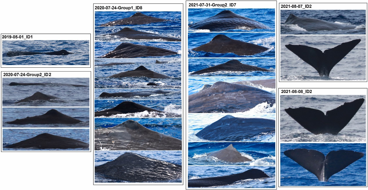 近年來,深海所研究團隊在海南島以南的南海海域開展了多個深潛/遠海鯨類調查航次,共計觀察到100多群鯨豚動物,其中包含9群抹香鯨(平均集群規模為5頭個體)。特別需要指出的是,在這9群抹香鯨里,科研人員記錄到了7群育幼群體,每群包含幼年/亞成年個體1至2頭。通過辨識和對比所拍攝照片里抹香鯨的身體特征(如背鰭/尾鰭形狀、紋路、隆起、傷疤等),共計識別了22頭成年個體。