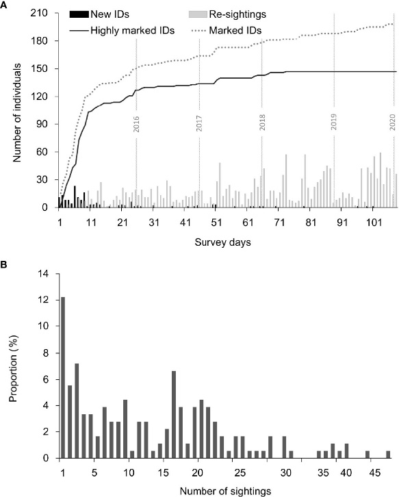 2015-2019年間,中科院深海所研究團隊和汕頭大學研究團隊共開展了112天實地調查,成功識別出了198頭海豚個體,包括147頭高辨識度個體(D≥3)。在合并數據集中,累積識別曲線在2017年年初達到平臺期,即已實現種群全覆蓋;其中123頭個體(83.7%)目擊次數超過5次,是該種群迄今為止質量最高的個體識別數據庫。