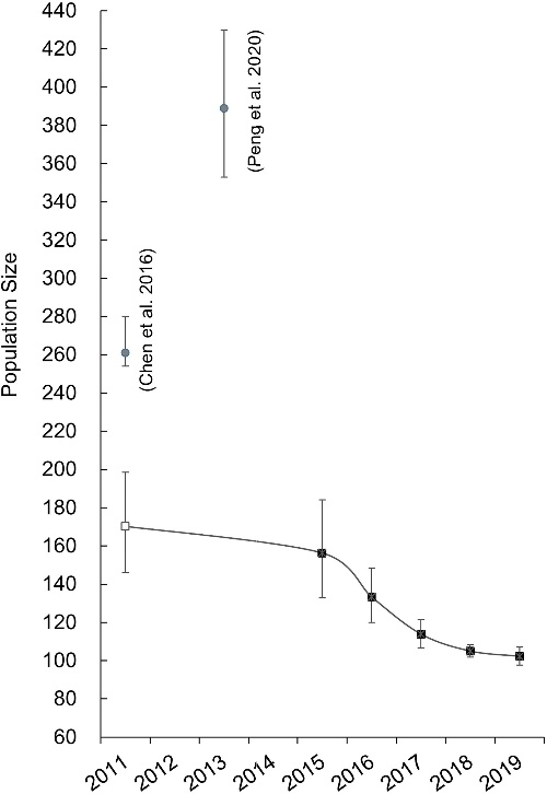 在此之前,已有兩個獨立研究對廣西三娘灣及其毗鄰海域的中華白海豚進行了種群規模研究,但研究結果并不一致。其中,Chen 等人首次提出該種群規模約為261頭(95%CI:254-280,2011-2014)。Peng等人在另一項研究使用相同的方法所獲得的結果為389頭(95%CI:353-430,2013-2016)。鑒于該海域與日俱增的人類活動 (如填海造地、海岸改造、誤捕和生態旅游等),及近海生態系統的持續惡化,研究人員認為該種群不存在種群膨脹的現實基礎。因此,這些研究的統計值不太可能反映該中華白海豚種群的動力學發展趨勢。