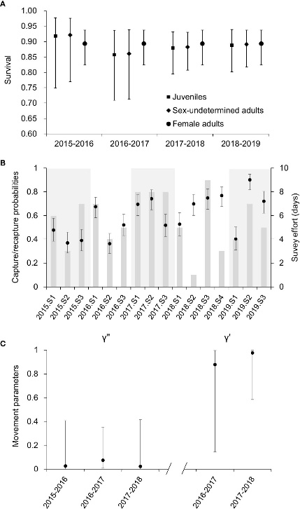 圖8.2015-2019年期間廣西三娘灣及其毗鄰海域中華白海豚(A)生存率du(B)捕獲概率和(C)運動參數估計