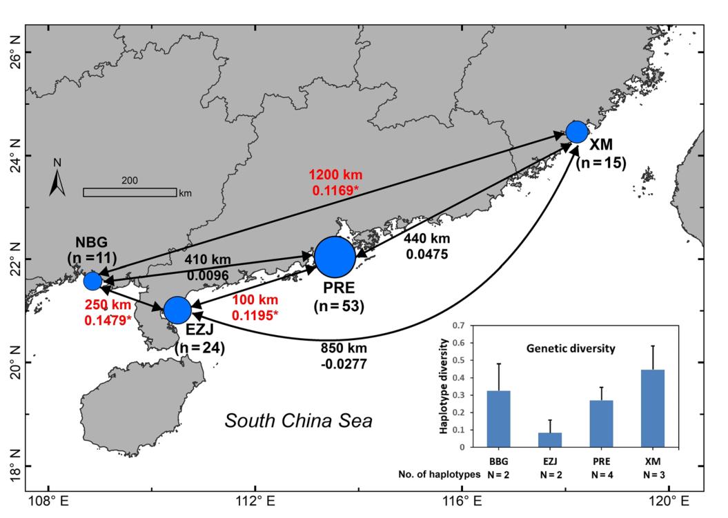 無論是基于照相識別的個體交叉比對結果,還是遺傳學比較研究結果,都表明我國中華白海豚不同地理種群之間目前已知的連通性非常差,地理種群間可能不存在個體交流,地理種群內的個體交流也不高,造成這一局面的機制是極其復雜的,既有物種本身近岸生活、活動能力有限的原因,也可能受到天然地理屏障的阻隔以及近岸人類活動的影響。