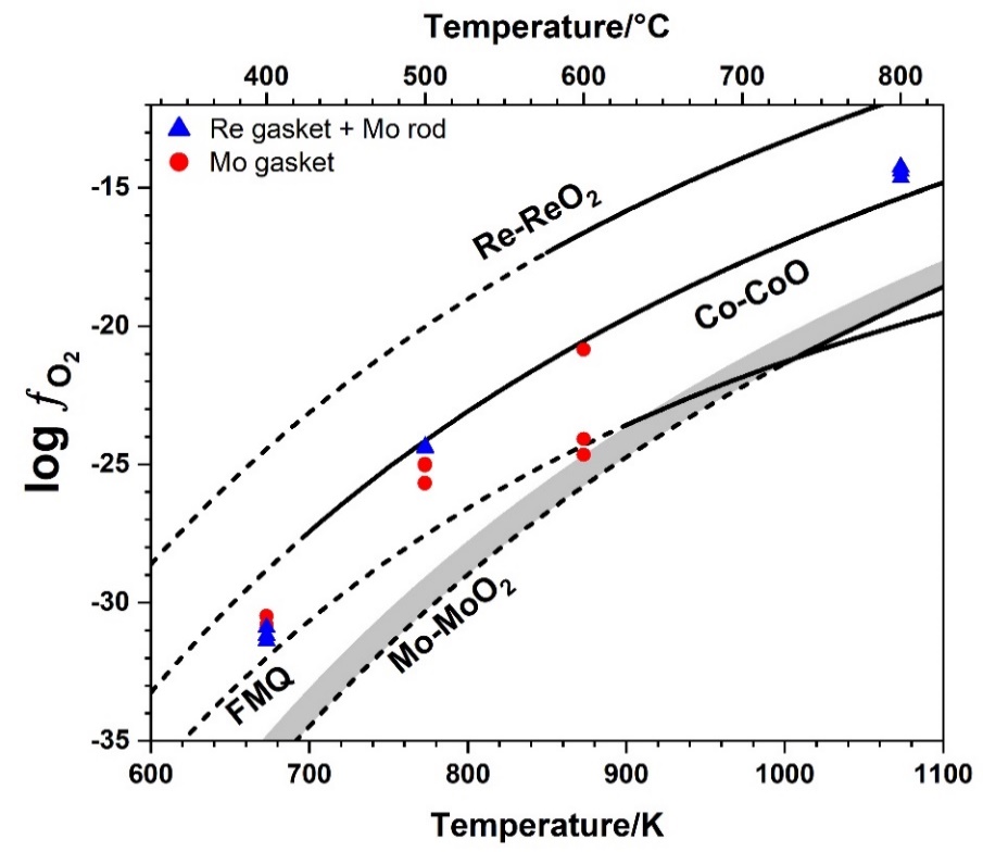 該論文依托實驗室熱液金剛石壓腔與激光拉曼分析平臺,開展了對熱液金剛石壓腔實驗中氧逸度的原位測量和計算,使用多種惰性(Re)和活性金屬(Ni, Co, MoW)墊片進行實驗,利用拉曼定量分析技術測量并計算了反應腔中的氫/氧逸度值,證明了在熱液金剛石壓腔實驗中實際氧逸度值與理論值有著較大的偏差(圖1),為高溫高壓熱液實驗中的氧逸度控制技術的開發與應用提供了理論和數據支撐。