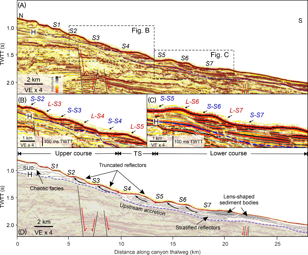 圖一 深海海底峽谷的中泓線地震剖面特征