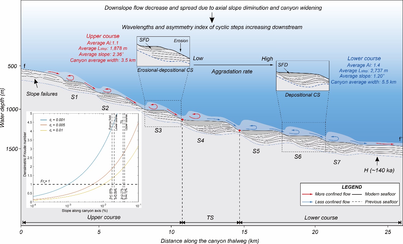 由峽谷頭部海底滑坡觸發的濁流,流經峽谷上游區域時,產生小波長和低不對稱性的周期階坎;流經峽谷下游區域時,則產生大波長和高不對稱性的周期階坎;在峽谷末端,隨著峽谷擴寬及海底坡度降低,周期階坎逐漸消失,超臨界濁流繼續侵蝕局部限制性區域,產生了大量平行于峽谷軸向的溝槽(圖三)。