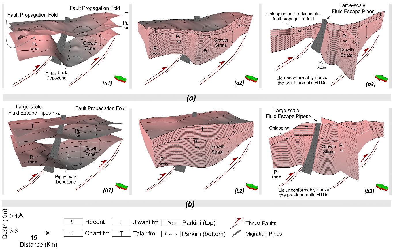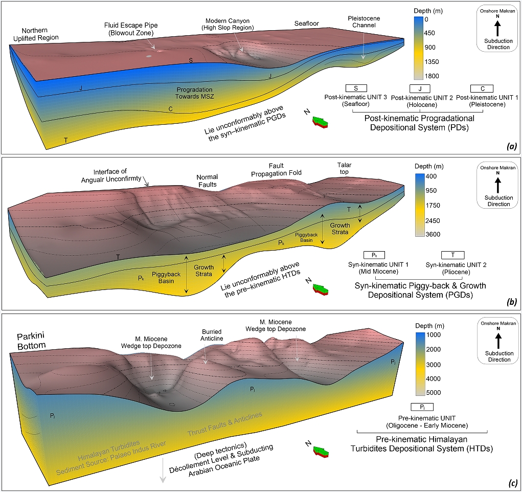 In order to address the above mentioned challenges, the current research focuses on an example from the offshore Makran accretionary wedge (MAW) located in the northern Arabian Sea, where the Arabian oceanic crust obliquely subducts beneath the Eurasian plate. This research employed innovative geological and geophysical constraints derived from seismic stratigraphy, correlation panel of borehole stratigraphy, seismic attributes, depth structural maps, isopach maps, and 3D structural geological models to understand the interplay between (1) the thrust wedge deformational pattern triggered by Middle Miocene renewed subduction of Arabian-Eurassian plates, (2) tectonically-induced fluid overpressure, and (3) deformational pattern of wedge-top syn-kinematic and post-kinematic sedimentary depositional systems of the offshore MAW.
