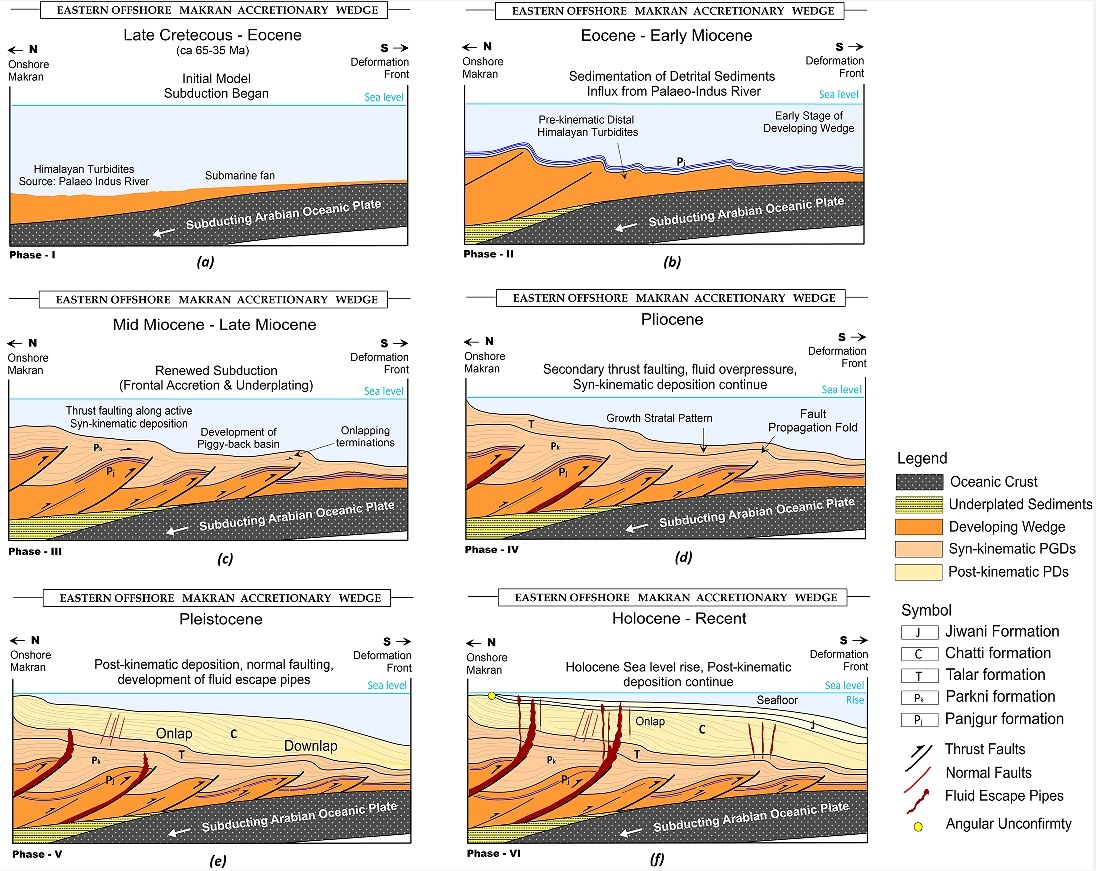 Summarized model specific to Makran accretionary wedge evolution. These illustrate the evolution of inferred deformation of thrust wedge, tectonically-induced fluid overpressure, and deformation pattern of wedge-top sedimentary depositional systems (north to south).