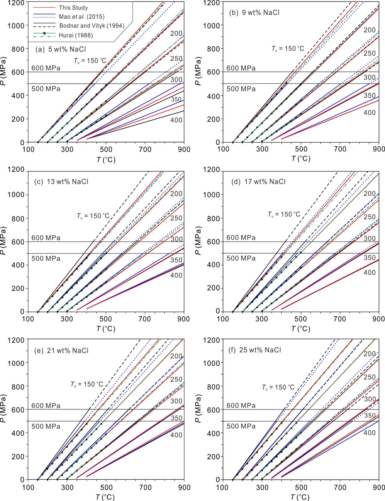 圖1. 實(shí)驗(yàn)測定的NaCl-H2O等容線(紅色線)與前人等容線的對比