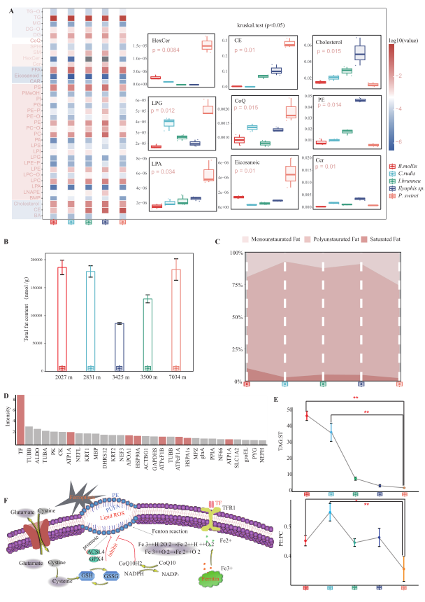 深海魚類普遍具有較大的肝臟組織,尤其是深淵獅子魚膨大的肝臟特別引人注目。該研究中,科研團隊對捕獲于馬里亞納海溝不同深度(2,027至7,125米)的五種深海魚類(包括Bathysaurus mollis、Coryphaenoides rudis、Ilyophis sp.、I. brunneus以及馬里亞納海溝獅子魚(MHS)的肝臟組織脂質(zhì)代謝組和蛋白質(zhì)組進行了深入的分析,揭示了深淵獅子魚獨特的生存策略。研究檢測了8個大類,36個亞類的脂質(zhì)分布,結(jié)果表明MHS與其他四種深海魚類的總脂質(zhì)水平相當(dāng),三酰基甘油(TG)作為主要的能量儲備,在深海魚類脂質(zhì)組中均占據(jù)主導(dǎo)地位。此外,自由脂肪酸(FFA)、膽固醇及其酯類(CE,膽固醇)、磷脂和二酰基甘油(DG)也是深海魚類肝臟中主要的脂質(zhì)成分。磷脂和甾醇是膜結(jié)構(gòu)的重要組成部分,而自由脂肪酸對于深海魚類的細(xì)胞調(diào)節(jié)至關(guān)重要。研究發(fā)現(xiàn),馬里亞納獅子魚通過顯著增加肝臟中的膽固醇酯(CE)、醚鍵三酰基甘油(TG-O)、輔酶Q(CoQ)和ATP酶含量,幫助其在食物匱乏的條件下儲存和有效利用能量。這種機制極大地延長了獅子魚在深海環(huán)境中的生存能力,尤其是在長時間禁食的情況下,這些分子儲備可被分解用于提供能量。
