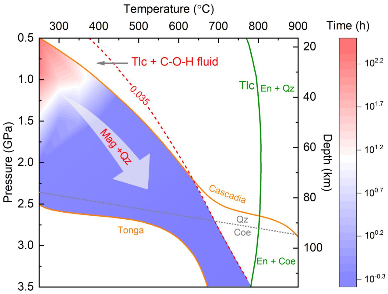 本研究采用金剛石壓腔(DAC)結合原位拉曼光譜技術,系統研究了俯沖帶溫度壓力條件下滑石與C-O-H流體的碳酸化反應過程。研究結果發現滑石在溫度> 250°C、壓力>1 GPa時,可快速轉化為菱鎂礦與石英,有效地將流體中的CO2封存到新形成的熱力學更穩定的菱鎂礦中,從而被挾帶進入地球深部(見附圖)。此外,滑石碳酸化后還可能通過改變俯沖帶礦物組成,影響到包括地震活動性在內的動力學過程。本研究的結果構建了滑石碳酸化反應的熱力學相圖,為更好地理解地球深部碳循環過程和受相變影響所致的地球動力學行為提供了必要的實驗約束。
